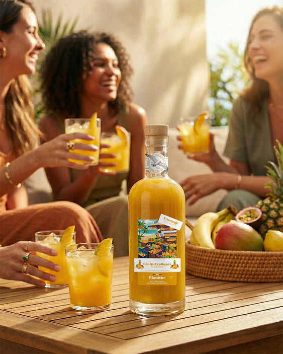 Blend de rhum de l'île de la Réunion et des Iles Françaises, Fruits Exotiques (Ananas, Mangue, Passion, Banane), Epices et Sucre de canne.
